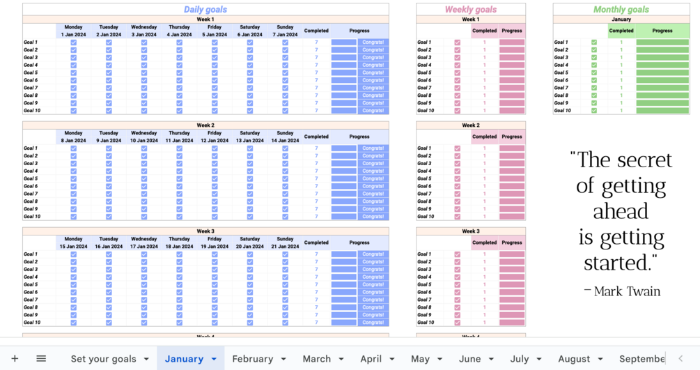 Embark on a journey of personal triumph with my Ultimate Goals Tracker! Whether it's daily, weekly, monthly, or yearly, it adapts to your goals seamlessly, simplifying your path to success.
